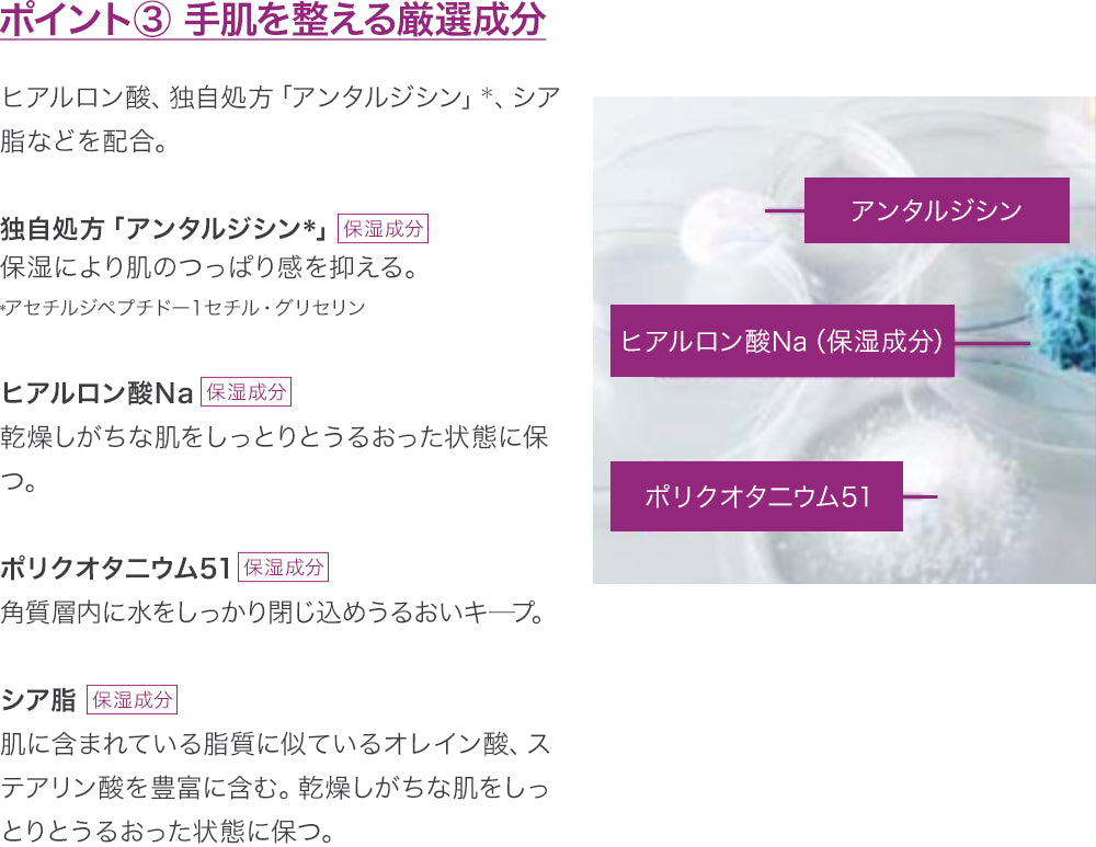 乾燥しがちな肌をしっとりとうるおった状態に保つ。