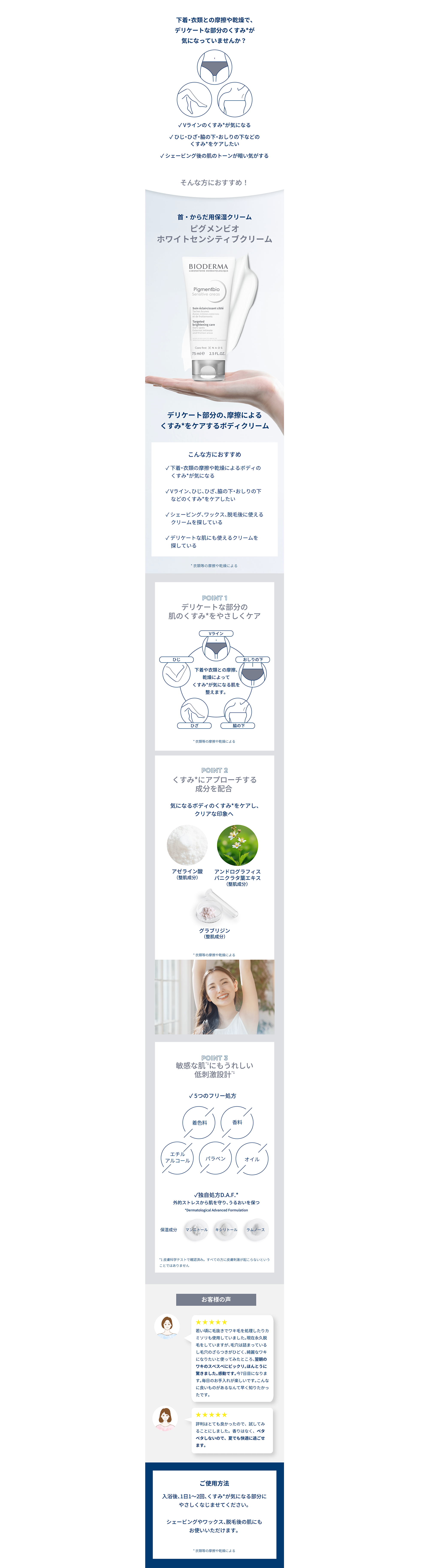 くすみ*やすいデリケートな肌のコンディションを整え、うるおいとつやを与えます。デリケートゾーンのコンディションを整え、しっとり、なめらかな肌へ導きます。