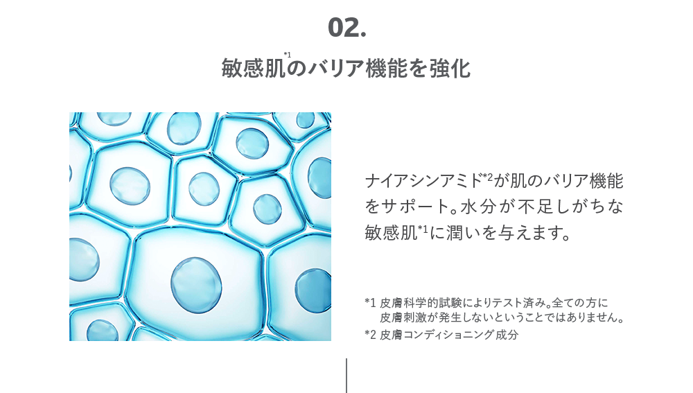 ■ ナイアシンアミド(皮膚コンディショニング成分):肌のバリア機能をサポート。水分が不足しがちな敏感肌*¹に潤いを与えます