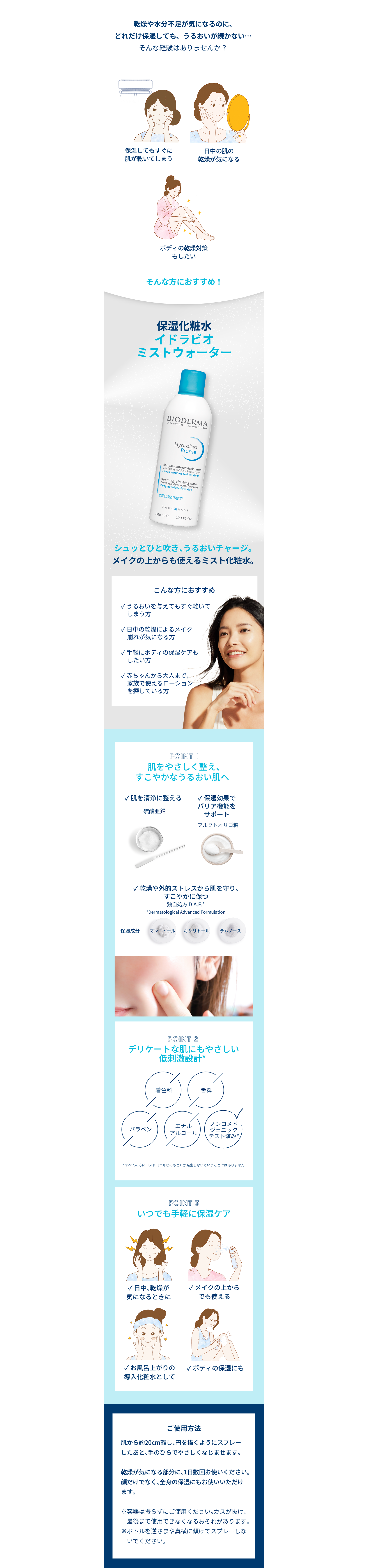 いつでも、どこでも簡単に保湿ケアができるスプレータイプの保湿化粧水。デリケートな肌状態をやさしく落ち着かせ、すこやかなうるおい美肌へ導きます。顔だけでなく、全身の保湿に、赤ちゃんから大人までお使いいただけます。