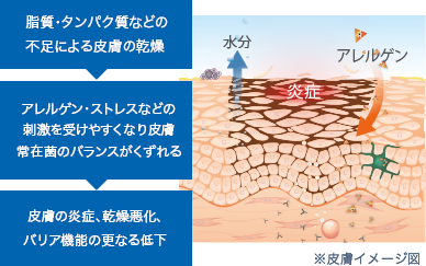 遺伝要因と環境要因によって、肌(皮膚)のバリア機能が弱められることで起こります。