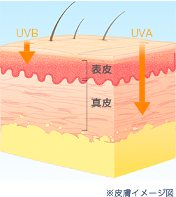 ●UVB(紫外線B波)波長が短く、肌表面の表皮へのダメージが強いため、赤くヒリヒリするような日やけを引き起こし、シミやソバカスなどの色素沈着の原因になる。