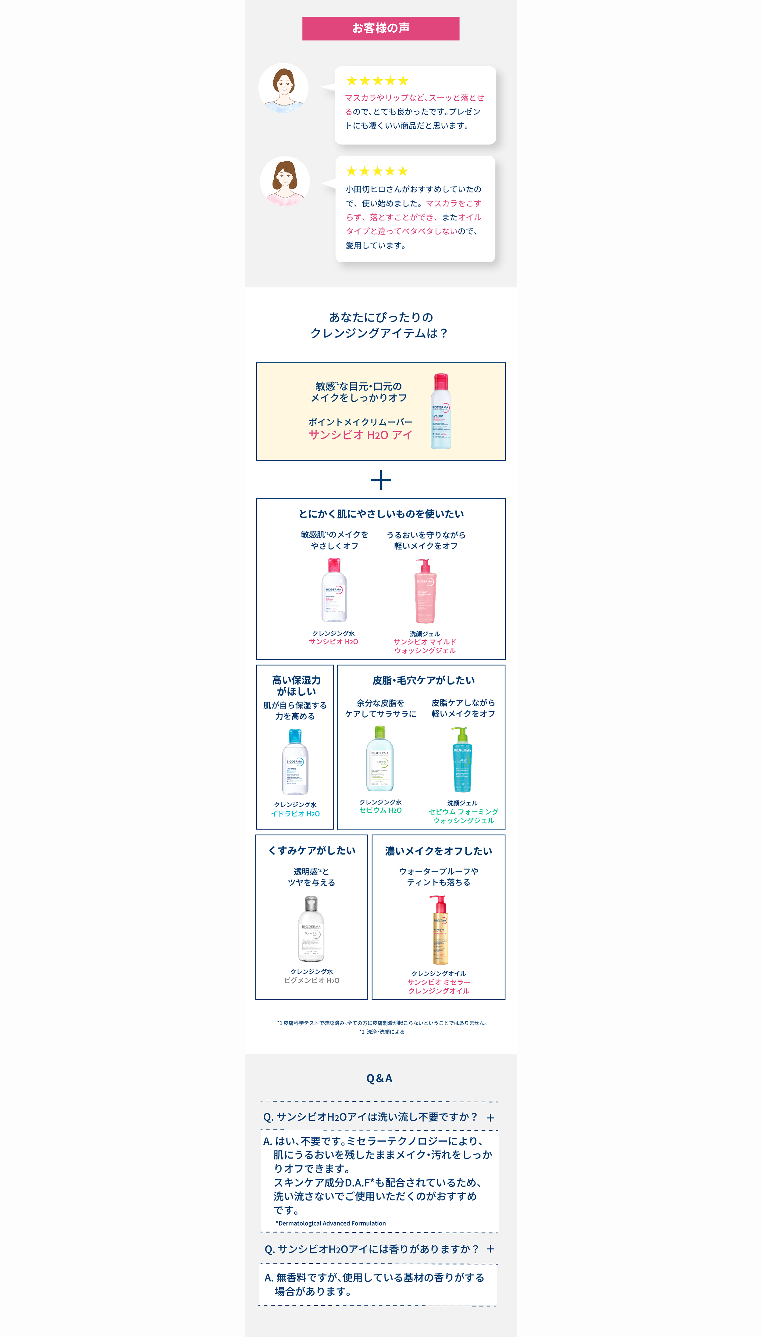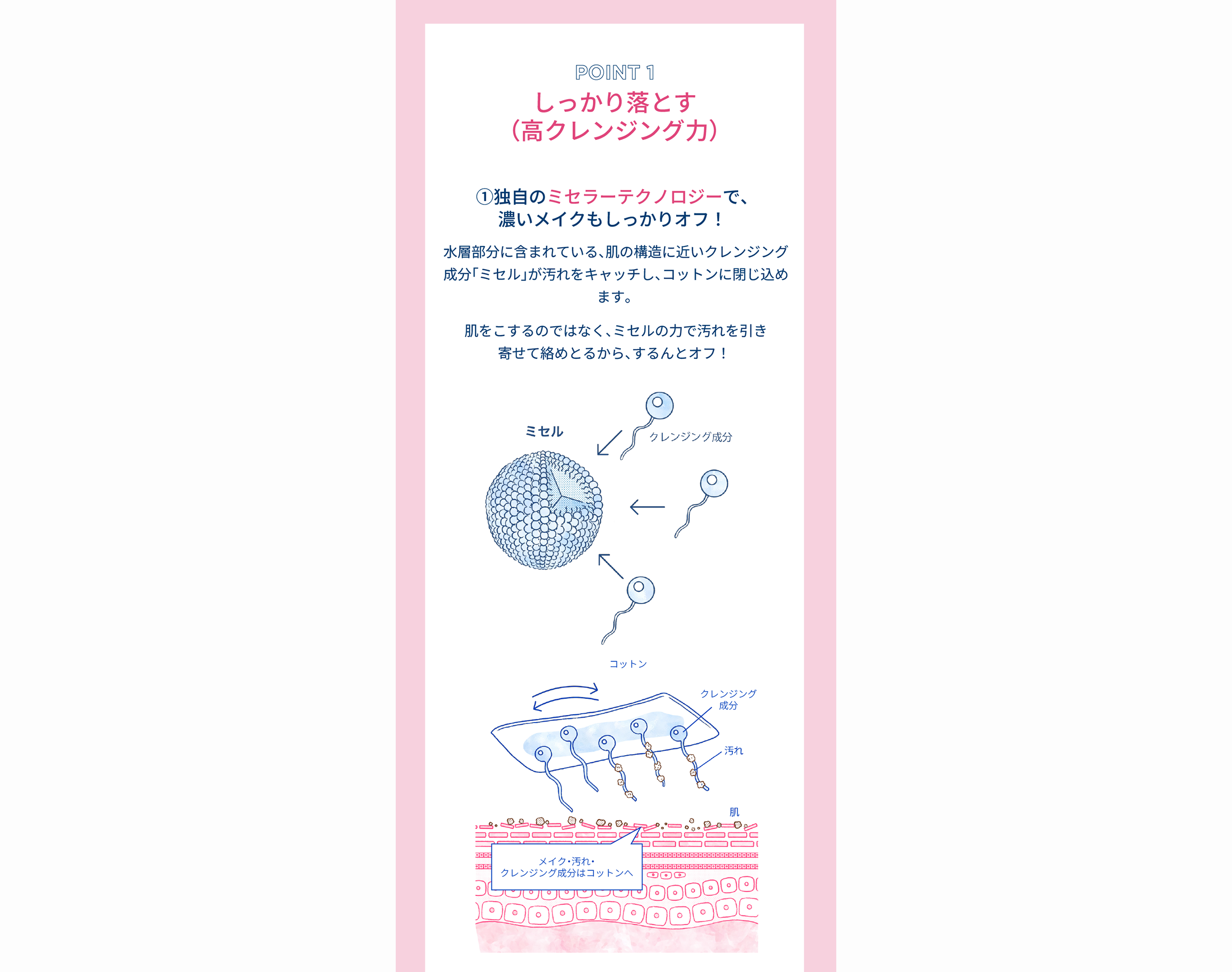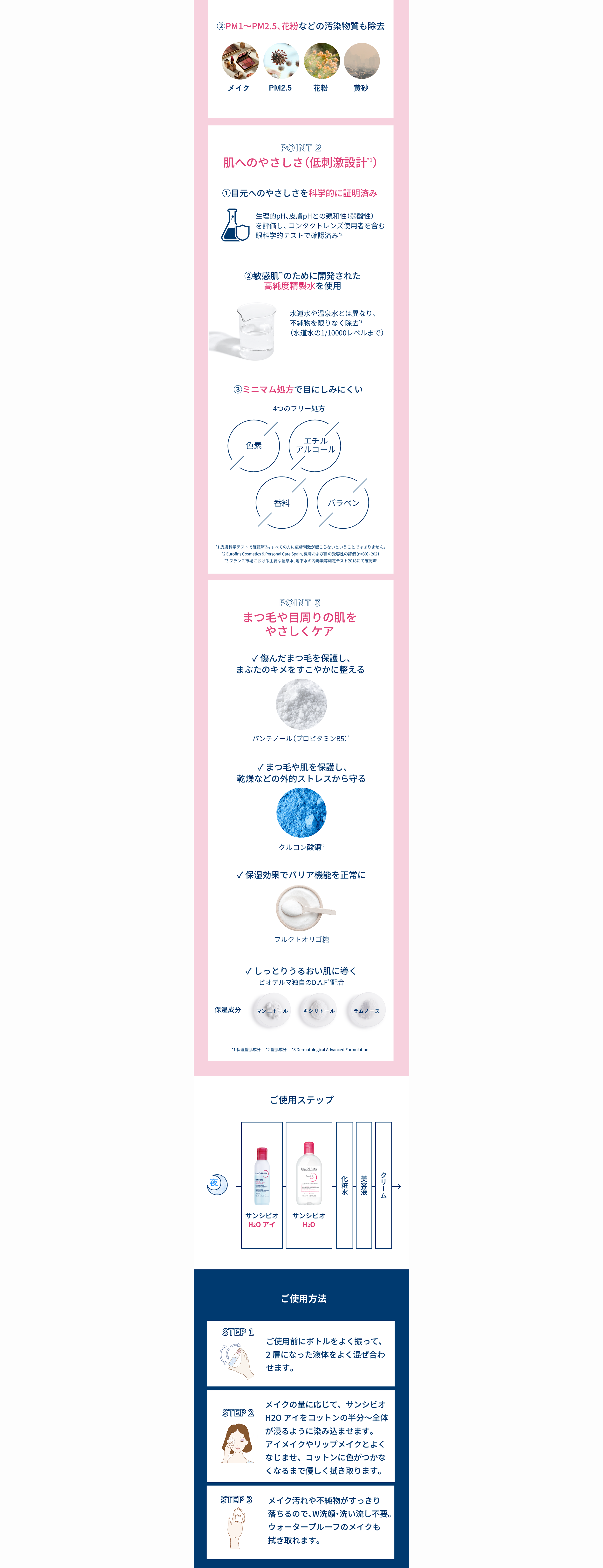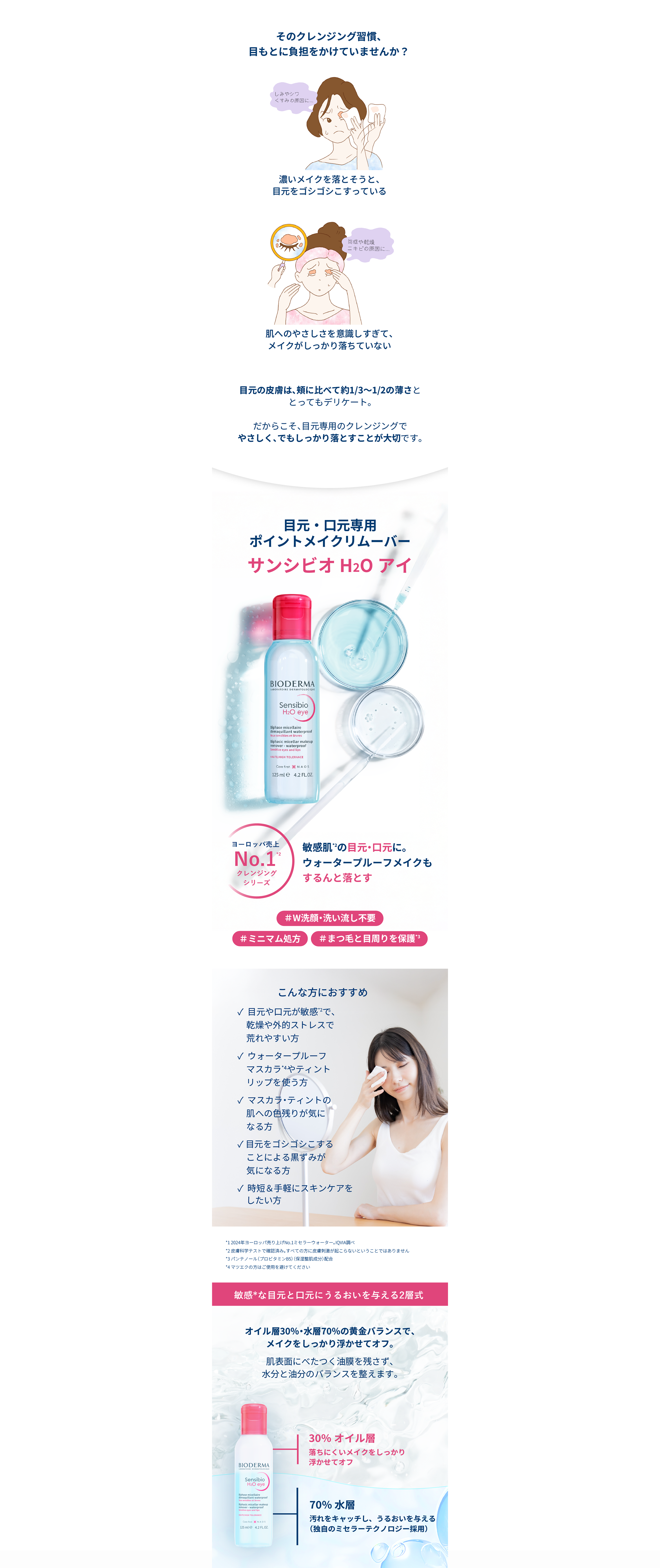 ビオデルマ独自のミセラーテクノロジー(70%)と親油性層(30%)の2層式がウォータープルーフメイクも効果的に落とし敏感な目元と唇にうるおいを与えます。